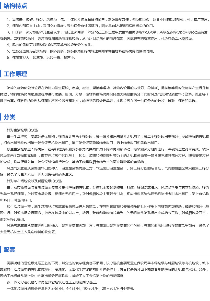 在垃圾的處理當中,垃圾分類及是將固體廢料當中可回收利用的或者是不利於後續處理的,處置工藝要求的物料分割出來。是固體廢料處理工程當中較為重要的設備之一。