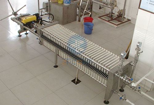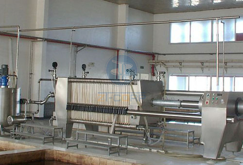 本機是由若幹個壓榨機單元組成,而每個壓榨單元是由濾板、濾框、紙板構成,紙板夾於板框之間作為吸附過濾介質——矽藻土的支承板。過濾前先塗好預塗層,即先將含有一定數量的矽藻土混合液用泵以一定壓力輸入機內的各過濾單元,並進行流動循環以產生壓差,使矽藻土較均勻地吸附於紙板表麵,形成了過濾層、預塗層,壓榨時被濾液經泵的壓力輸入機內,分別流入各壓榨單元,通過矽藻土壓榨層及紙板截留了被濾液中的殘餘物,而濾後的清液再由各個壓榨單元集於一起,從清液管流出機外,從而達到了淨化目的。
