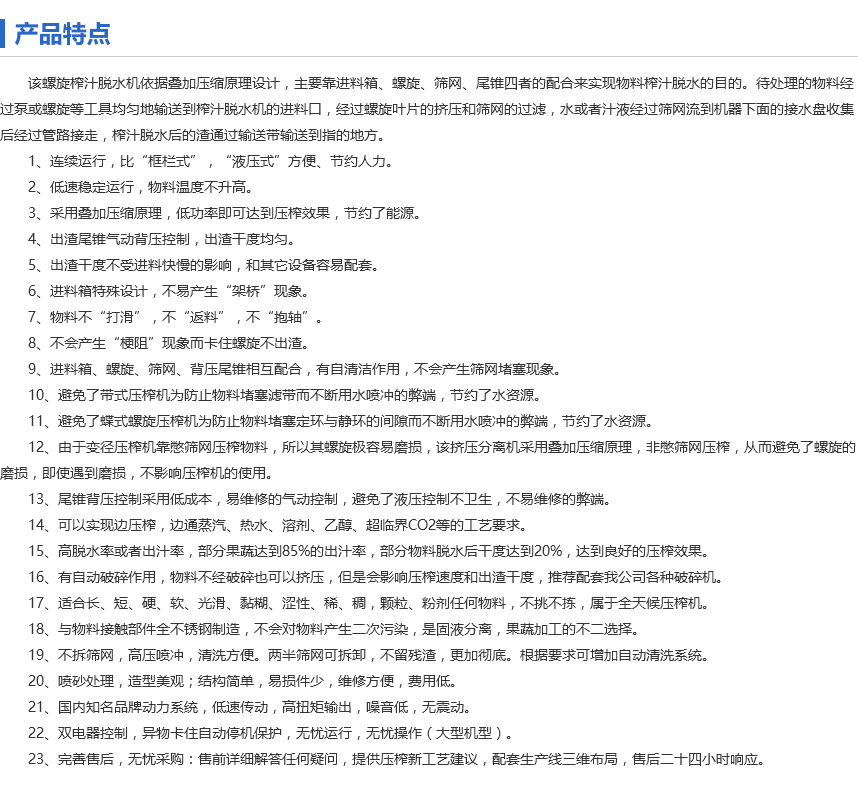 午夜性爱福利壓榨脫水機是用於有機物料擠出液和無機物料渣分離的擠出分離設備。是我公司第三代擠出分離設備。但這不是擠壓分離器的簡單升級和升級,而是顛覆性的設計和變更。篩網沒有堵塞,對進料濃度,粘度,硬度,焓,粒徑和纖維長度也沒有要求。該午夜性爱福利壓榨式脫水機運行平穩,平穩,故障率低,運行維護成本低,榨汁量高,脫水率高是其突出特點,擠出分離性能優異。市場上任何類型的壓力機和離心機。一些水果和蔬菜的果汁產量達到85%,核心果汁也具有獨特的功能。某些材料在脫水後的幹燥度為20%,顯示出令人滿意的結果,用普通的壓榨機或脫水器很難達到廢物回收的目的。果汁的重複利用或提取帶來可觀的經濟利益。它的印刷效率高,投入的成本可以在大約一個季節內收回,並且具有很高的性價比。